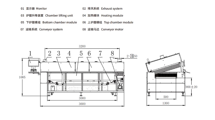 | 1.可選:機(jī)頭機(jī)尾可凸出,凸出上爐膛外側(cè)面尺寸300mm(整機(jī)尺寸會加長600mm)。 2.注明:根據(jù)產(chǎn)能要求,推薦溫區(qū)數(shù)量優(yōu)先選擇:4溫區(qū)、5溫區(qū)、 8溫區(qū)、9溫區(qū)、10溫區(qū)、12溫區(qū),可定制。 | |||