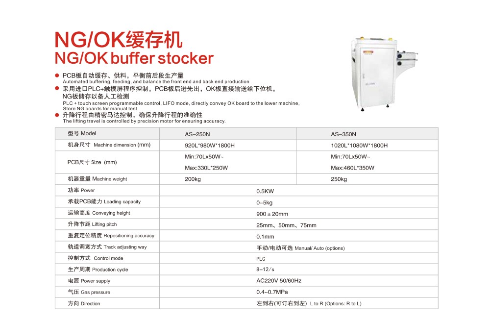 NG/OK緩存機介紹:PCB板自動緩存、供料,平衡前后段生產量;采用進口PLC+觸摸屏程序控制,PCB板后進先出,OK板直接輸送給下位機,NG板儲存以備人工檢測;升降行程由精密馬達控制,確保升降行程的準確性;