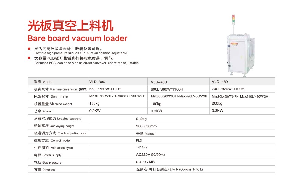 PCB尺寸(mm) Min:80Lx50W*0.7H~Max:330L*300W*3H Min:80Lx90W*0.7H~Max:420L*400W*3H Min:80Lx90W*0.7H~Max:510L*460W*3H