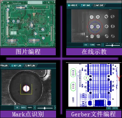 支持CAD、Gerber、坐標文檔、圖片文檔多種方式進行編程,標配示教相機,可在線視覺編程。支持離線編程。每個焊點參數都可獨立設置。全程可視化操作,在線調試方便快捷。自動優化焊接順序,節省焊接時間。可提供MES系統接口。