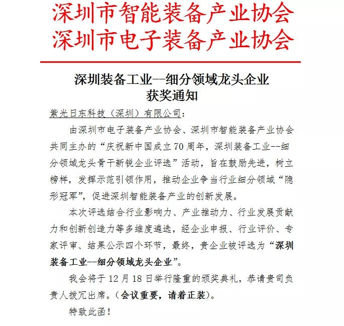 2019年12月18日,由深圳市電子裝備產業協會、深圳市智能裝備產業協會主辦的“深圳裝備工業—細分領域龍頭骨干新銳企業”評選活動,在深圳市福田區會展中心舉行盛大的頒獎典禮,經過組委會的層層篩選,日東科技在本次評選中獲得了細分領域”龍頭企業“的殊榮!