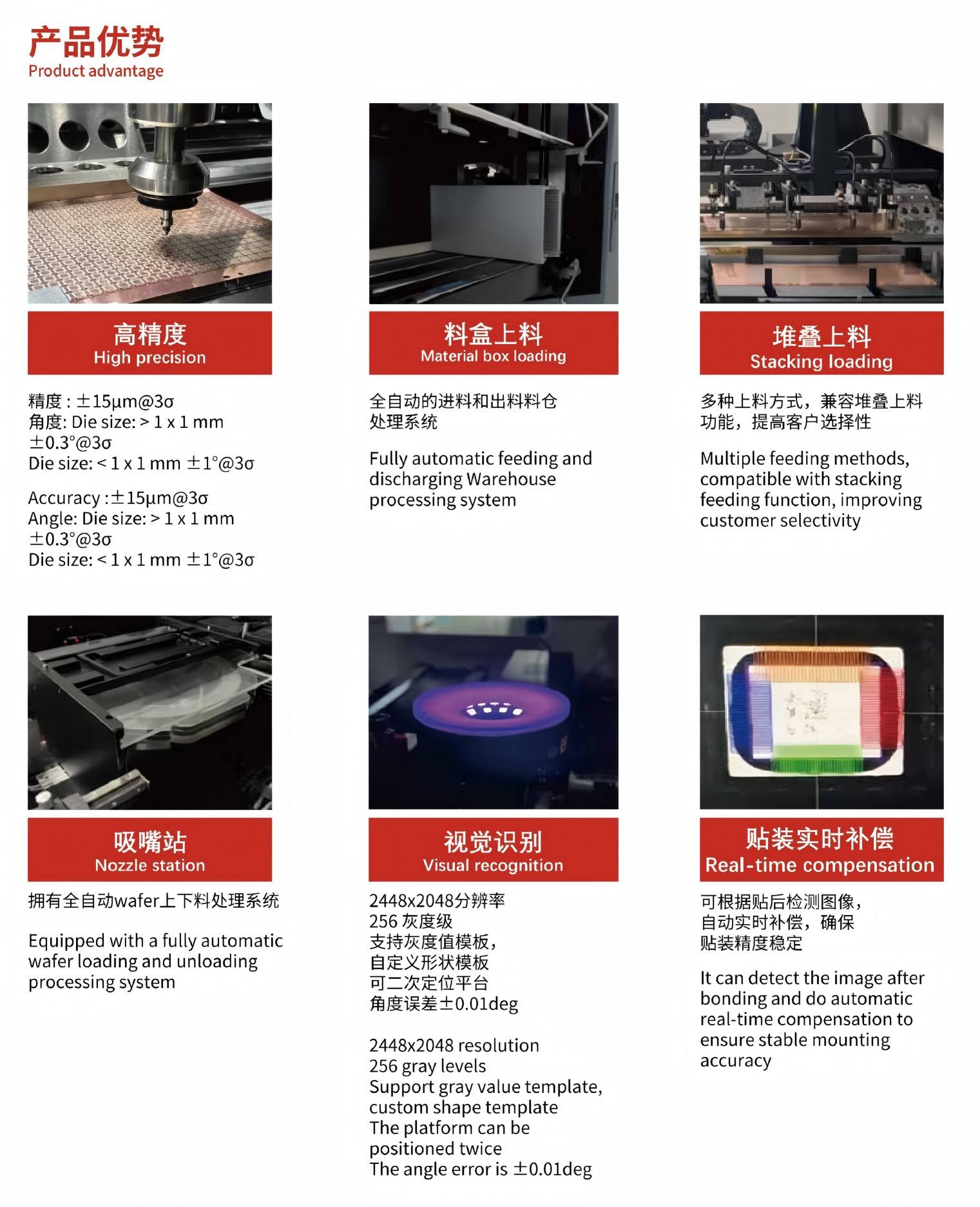 通用型高精度芯片貼合機,應對大批量wafer上料的貼裝產品,適用于SIP封裝、Memory Stack Die(存儲芯片堆疊)、CMOS 、MEMS等工藝。