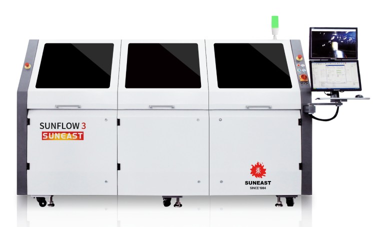 針對汽車板元件的焊接,具有空間小,焊點質量高,免清洗性的特征,在助焊劑噴涂時選用免清洗助焊劑,通過控制助焊劑噴涂量,在保證噴涂效果良好的情況下,可以節省95%左右的助焊劑。預熱模塊采用分段式控制,自動校正溫度功能,既能滿足汽車板所需的高溫度,同時也可節約設備耗電量。電磁泵錫爐可以提供穩定的高波峰,對焊點進行焊接,保證焊點的高質量