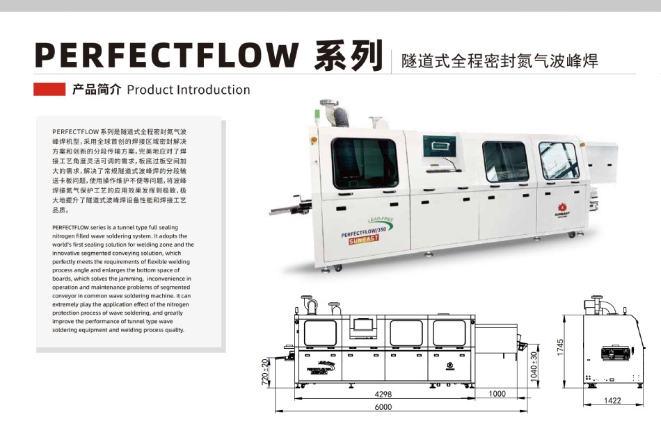PERFECTFLOW 系列隧道式全程密封氮?dú)獠ǚ搴福捎萌蚴讋?chuàng)的焊接區(qū)域密封解決方案和創(chuàng)新的分段傳輸方案,完美地應(yīng)對了焊接工藝角度靈活可調(diào)的需求,板底過板空間加大的需求,解決了常規(guī)隧道式波峰焊的分段輸送卡板問題,使用操作維護(hù)不便等問題,將波峰焊接氮?dú)獗Wo(hù)工藝的應(yīng)用效果發(fā)揮到極致,極大地提升了隧道式波峰焊設(shè)備性能和焊接工藝品質(zhì)。