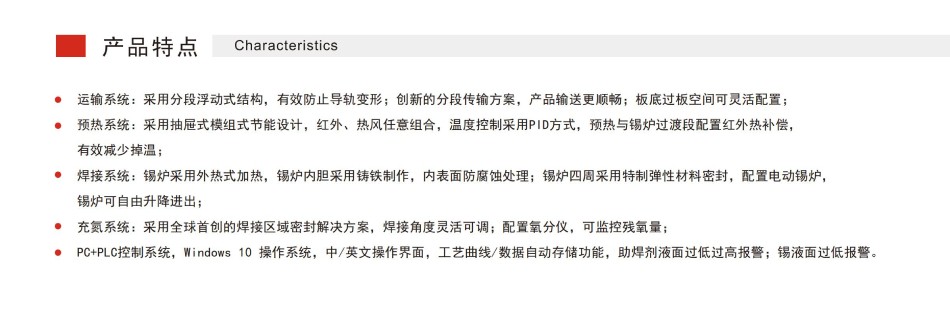 PC+PLC控制系統(tǒng):Windows10操作系統(tǒng),中/英文操作界面,工藝曲線/數(shù)據(jù)自動(dòng)存儲功能,助焊劑液面過低過高報(bào)警;錫液面過低報(bào)警。
