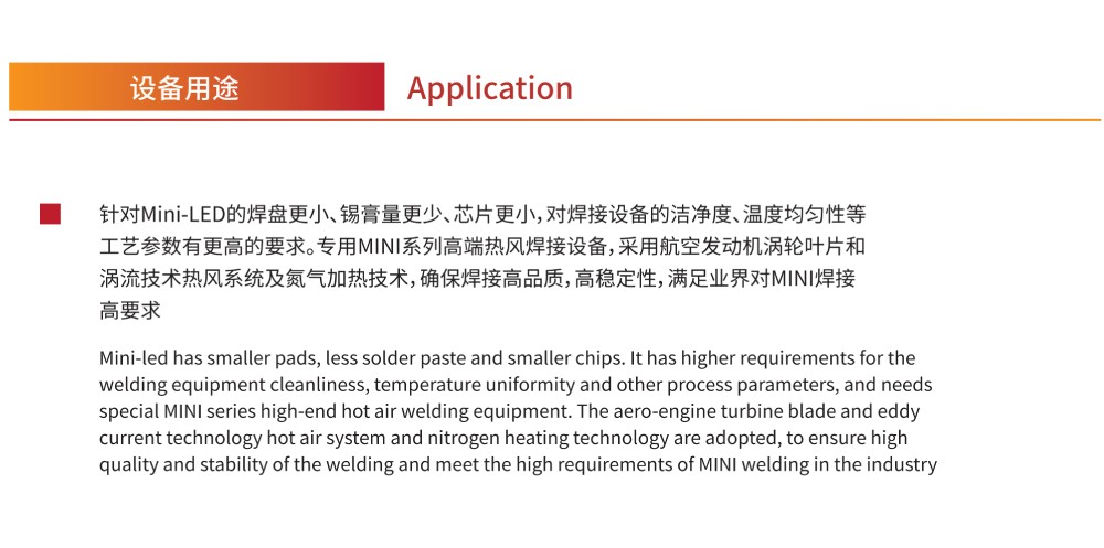 針對(duì)Mini-LED的焊盤(pán)更小、錫膏量更少、芯片更小,對(duì)焊接設(shè)備的潔凈度、溫度均勻性等工藝參數(shù)有更高的要求。專用MINI系列高端熱風(fēng)焊接設(shè)備,采用航空發(fā)動(dòng)機(jī)渦輪葉片和渦流技術(shù)熱風(fēng)系統(tǒng)及氮?dú)饧訜峒夹g(shù),確保焊接高品質(zhì),高穩(wěn)定性,滿足業(yè)界對(duì)MINI焊接的高要求。